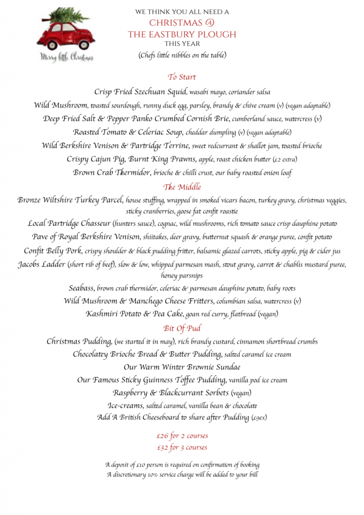 If you’re looking to have a festive meal out before Christmas Day here’s The Eastbury Plough’s Christmas Menu:
