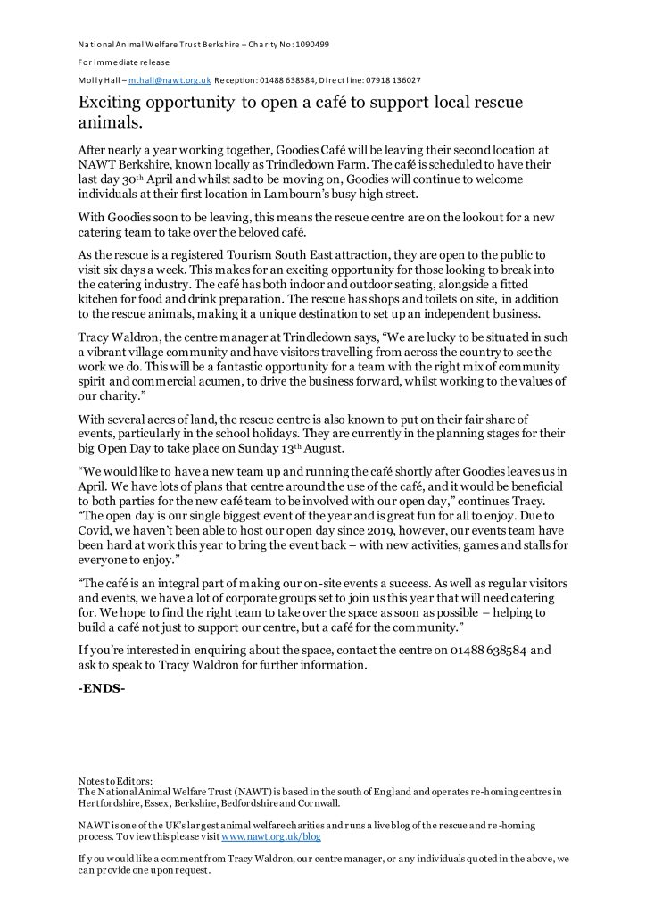 N.A.W.T at Trindledown has a Café opportunityNews / By Chris Capel / Leave a Comment There’s a great opportunity to take over a thriving café at the N.A.W.T Centre, Trindledown Farm nr. Great Shefford. The current caterers will be leaving at the end of April this year. See below for details and how to register an interest: