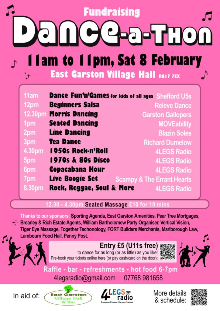 We don’t expect any single person to dance for 12 hours, just come on over and join in the fun to support two great causes in the Lambourn Valley – 4LEGS Radio and East Garston Village Hall.