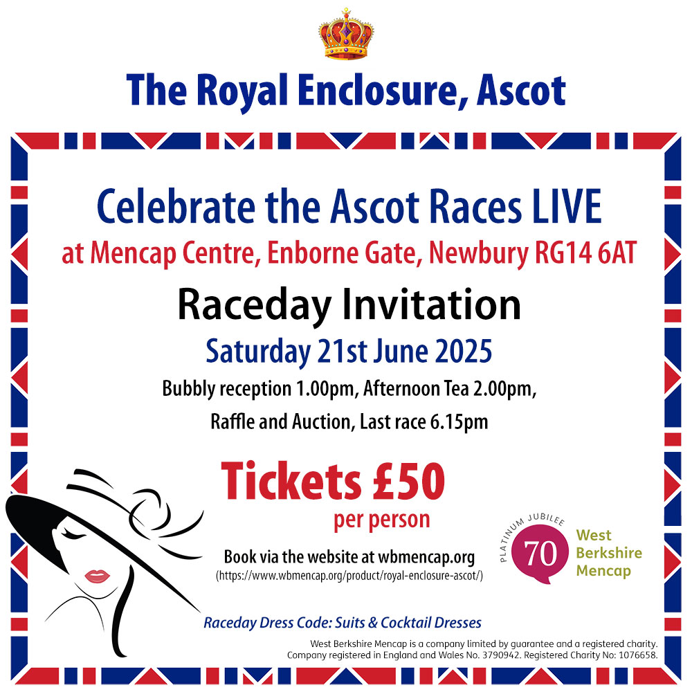 With this in mind will you support us for a fun afternoon out? It will be a great opportunity to dress up and enjoy the fun of the Ascot Races at the Mencap Centre. We are rolling out the Royal carpet for you on Saturday 21st June. Enjoy a glass of bubbly, canapes and a delicious afternoon tea, while watching the races from Ascot on a large screen. There will be tips from Colin Brown, who used to ride the famous Desert Orchid. To keep you entertained there is a bar serving Pimm’s, beer and wine. There is also an excellent raffle and auction for some fantastic prizes, including wonderful hampers, a meal for 8 delivered to your own home and a glamping night. See poster below: