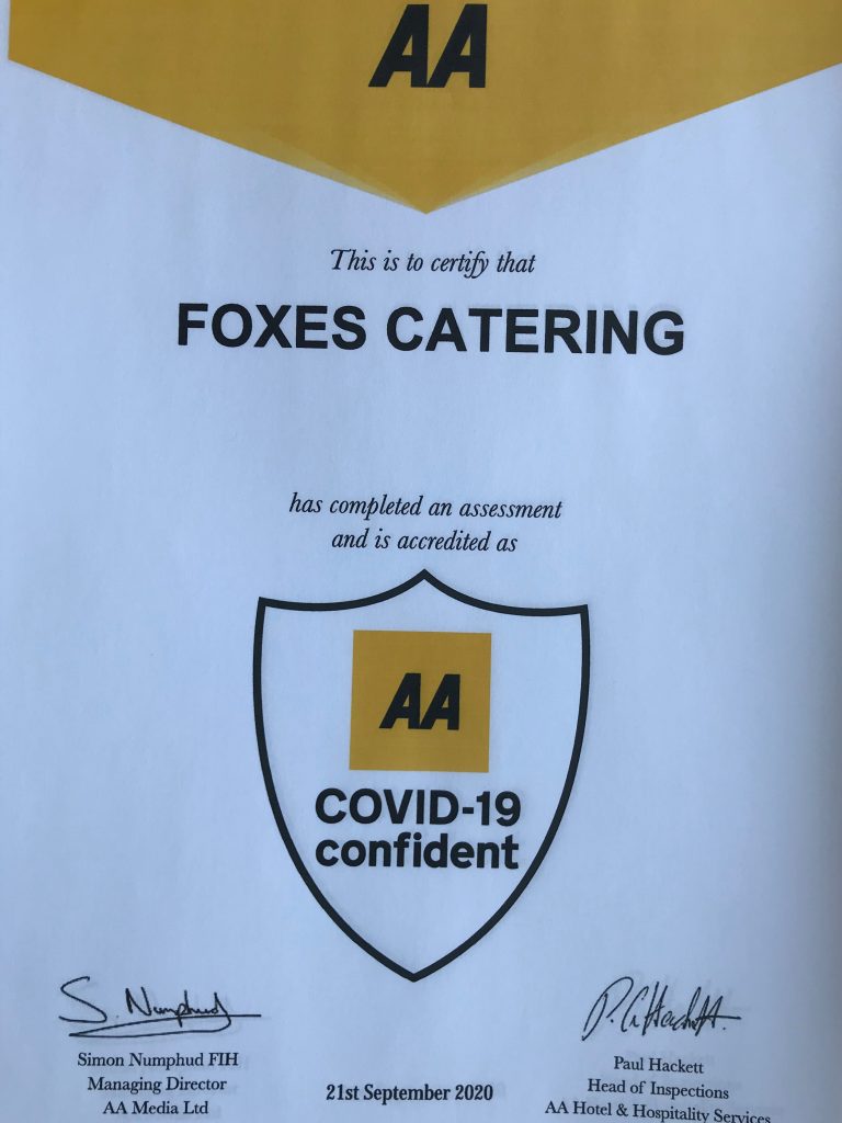 Foxes Catering have been awarded the Covid-19 Confident certificate from the AA (below), which is great news, and reassuring to all their customers: