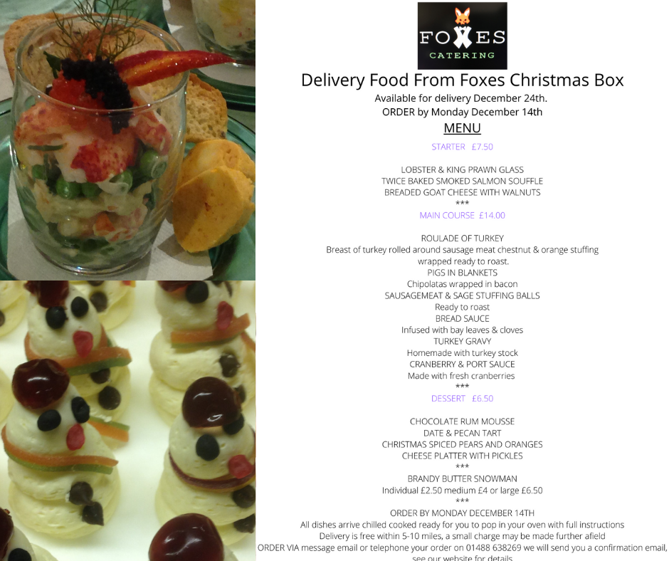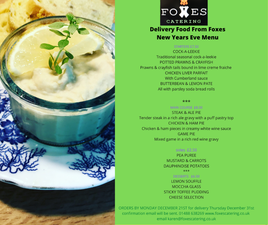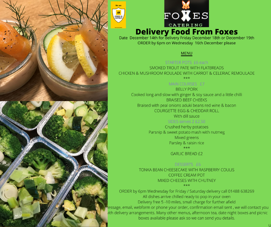 Here’s this week’s menu from Foxes Catering’s for ordering and delivery this week followed by a message from Nick & Karen: